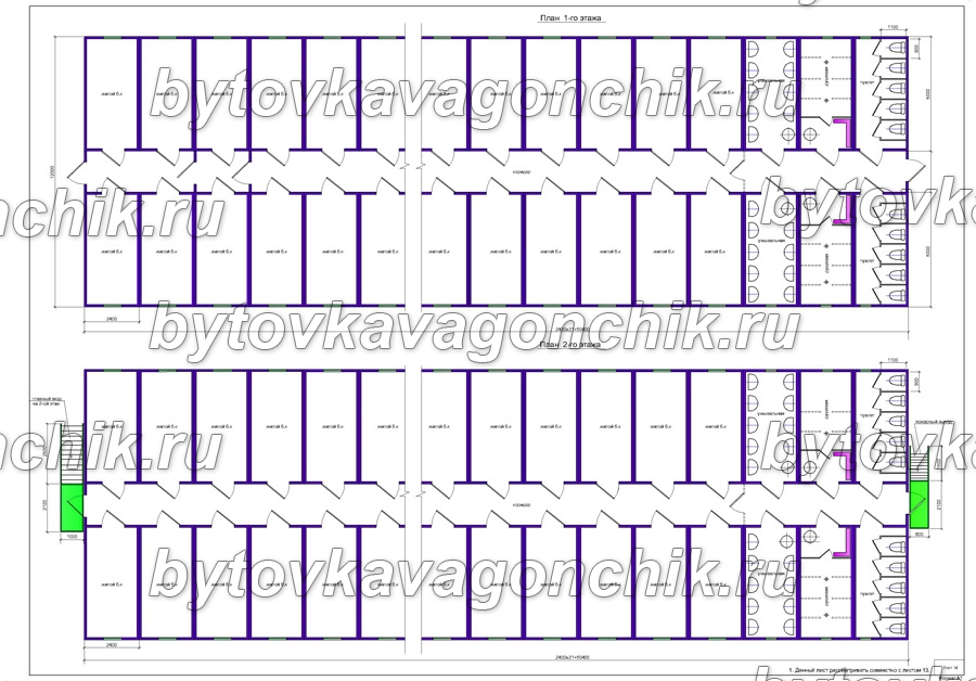 Планы двухэтажного общежития на 250 человек из 84 шт БК